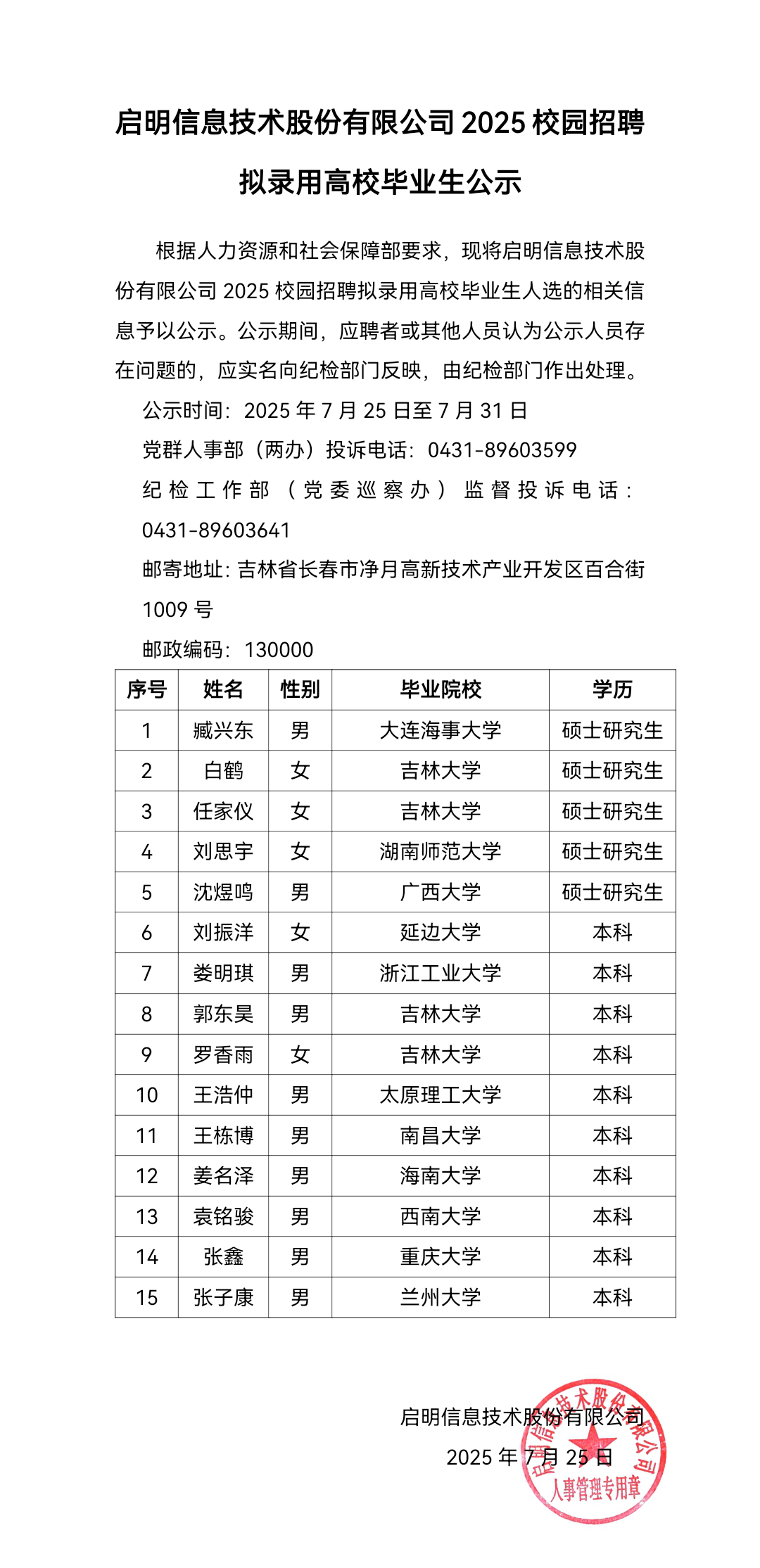 江南JNSport体育 信息技术股份有限公司2025校园招聘拟录用高校毕业生公示