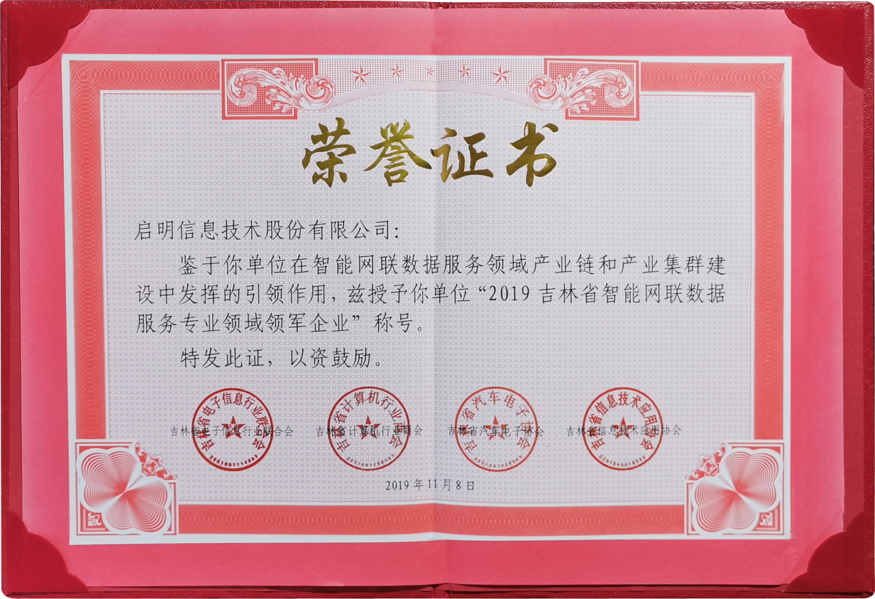吉林省智能网联数据服务专业领域领军企业-2019